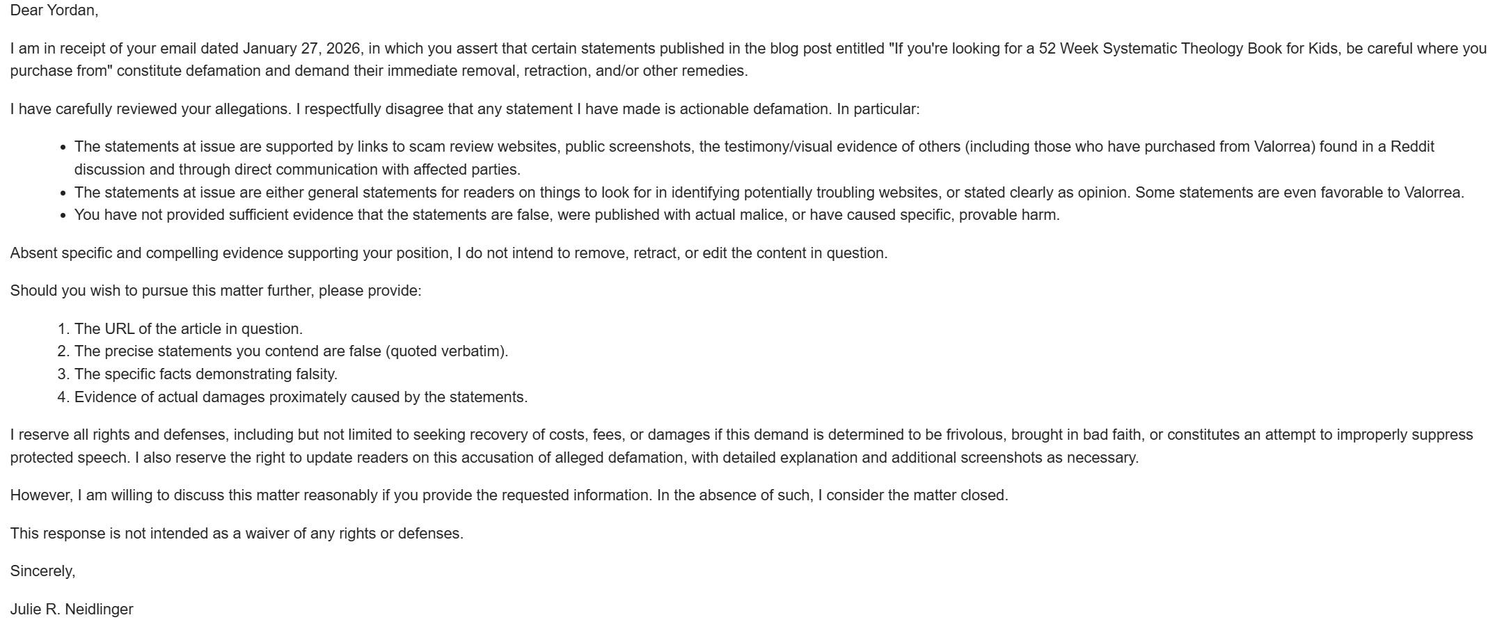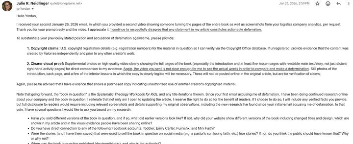 Someone named Yordan Terzov, with a Gmail address, sent a boilerplate email demanding I take down my original post about the 52 Week Systematic Theology Book for Kids. He sent it on January 27, 2025, at 5 p.m. from his time zone.