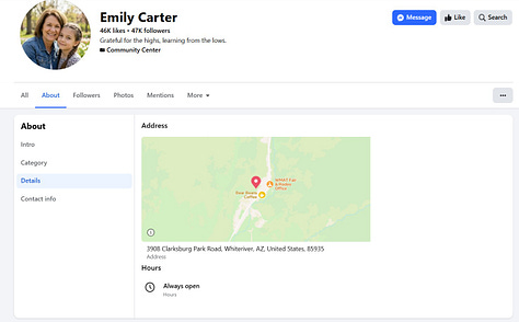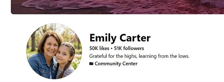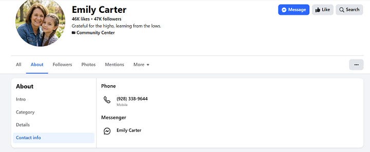 On January 28 at 11:58 a.m., I attempted to call one of these Facebook identities, “Emily Carter,” whose only apparent activity was promoting Valorrea products with no other typical past history. I also attempted to contact via Messenger from the “Emily Carter” profile, a white, grandmotherly-looking woman supposedly from Whiteriver, Arizona, who had the phrase “grateful for the highs, learning from the lows” in her profile.2 By that point, she already had 46K likes and followers. By February 19, 2026, she had 50K likes and 51K followers. People were still trickling in; the posts were still being shared.