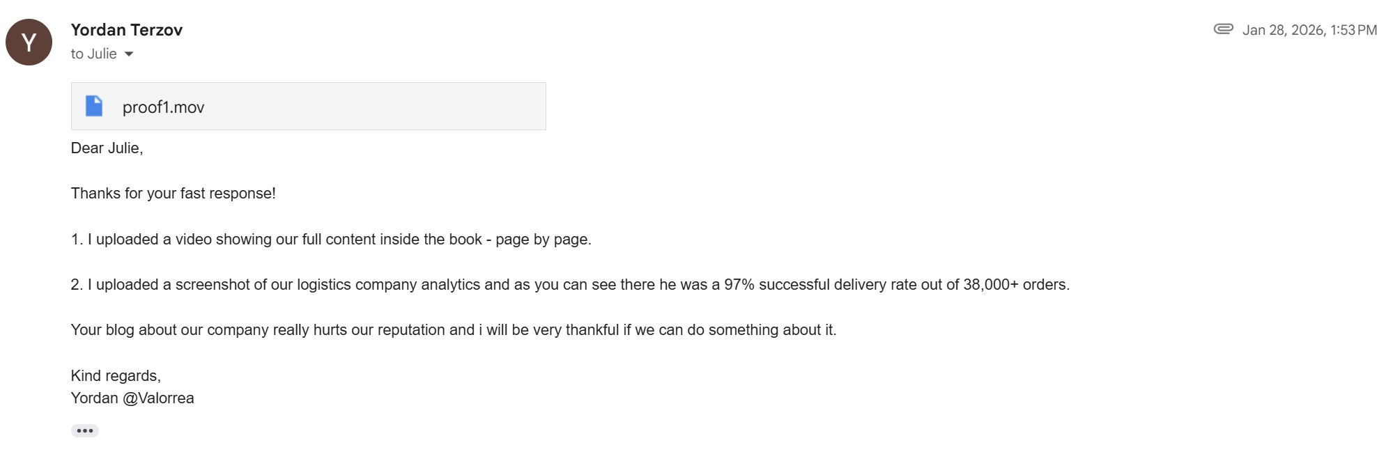 The first email contact Yordan should have sent out was not a boilerplate defamation threat. It should have been a friendly email asking if we could talk about the blog post and the concerns he had with it. You catch more flies with honey. His approach immediately put me on the defensive and, as you’ll see, made me dig further.