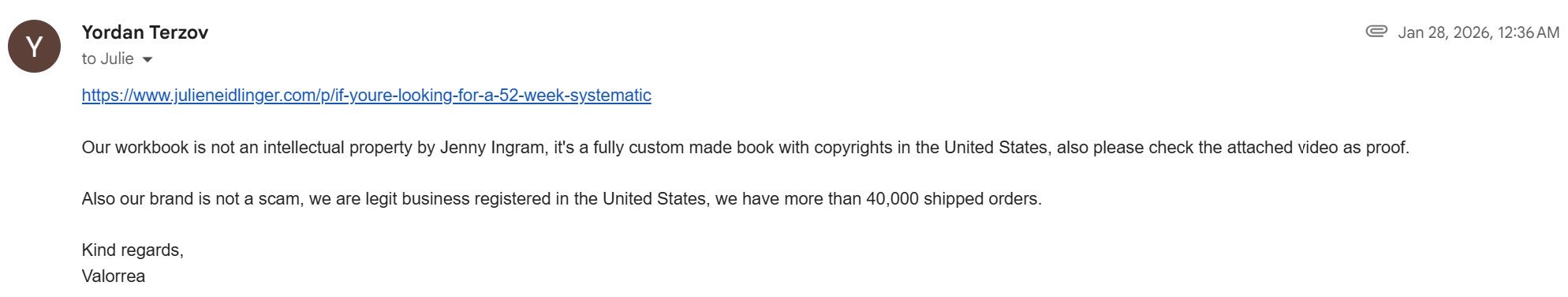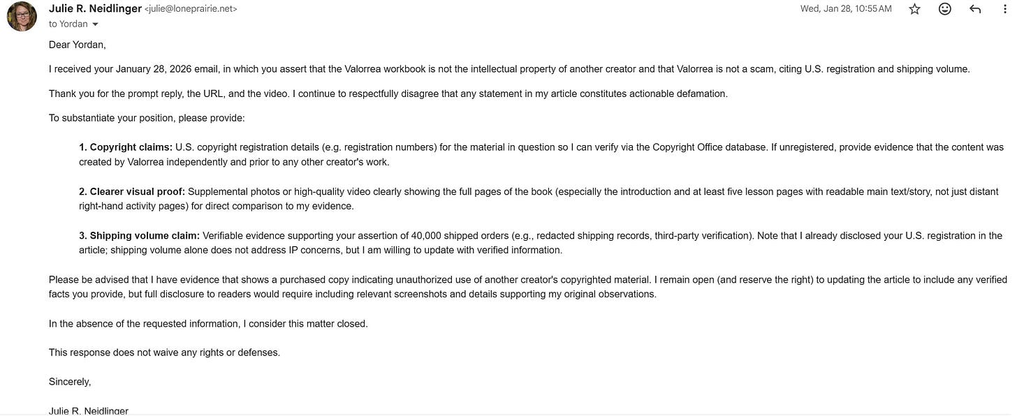 I don’t believe I ever called Valorrea a straight-up scam, but I mentioned them in a broader blog post about being cautious to avoid online scams and how to evaluate suspect websites; I offered cautions and provided evidence for why I, personally, would proceed with caution. I tried to show readers how to evaluate social media experiences that prompt them to make a purchase. I did not initially disclose that my parents’ bank had flagged Valorrea’s website as potentially fraudulent because I wasn’t looking to badmouth a company so boldly as to acknowledge that a financial institution wouldn’t allow a charge to go through.