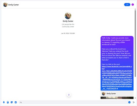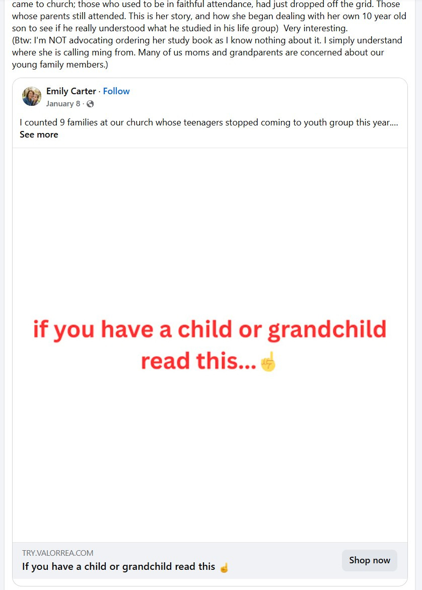 The posts in question all seemed to hit between about Christmas 2025 to mid/late January.3 This was the peak push on Facebook, it seemed. Emily Carter only needed to post a handful of times; once she tapped into the fear parents and grandparents have that their offspring will abandon their Christian faith in today’s culture—once it went viral—posts linking to the Valorrea website were shared by other users on Facebook.