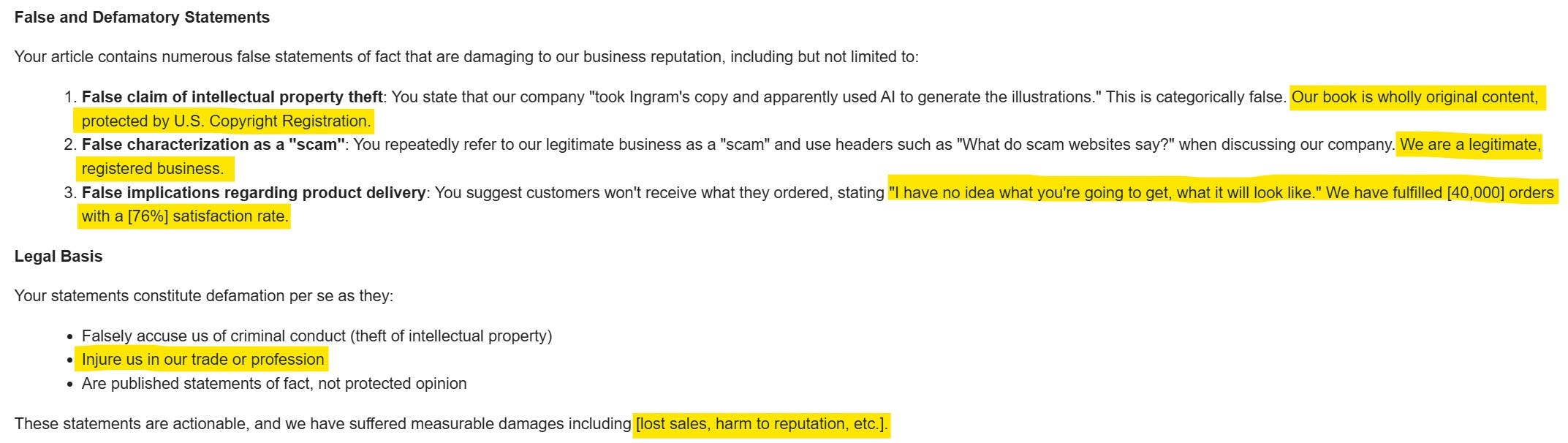 The last one, the [lost sales, harm to reputation, etc.], is how I knew it was likely AI-generated since that should have been replaced with actual copy pertinent to the claim, as it had been elsewhere in the email. For extra curiosity, I ran the copy through several AI checkers, and they all rated it as highly likely AI-generated.