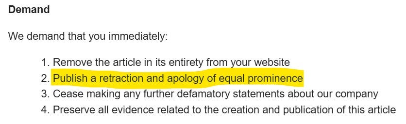 I had to decide what to do in that moment. I went back and read the original post, which I had tried to write fairly and carefully. I believed it stood on its own. Then I took a beat, re-read the email, and logically dissected it. Who sends an AI defamation takedown notice? I wondered. This is our future, I fear, AI as lawyer.
