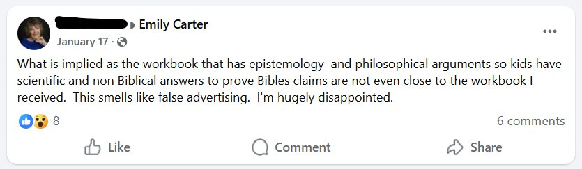 This would be more about apologetics than systematic theology, in my opinion.4 The two are not the same, though we certainly have a glut of Christians of all ages who could benefit not only from knowing what they believe (systematic theology) but also from understanding why it can be believed (apologetics). I took Systematic Theology in college (“Sys Theo”), and the book I’ve seen in the video is neither systematic theology nor even what I’d call apologetics. It’s more of a Bible story workbook, which is fine if that’s what you want, but it doesn’t really address the concerns raised in the viral blog posts.