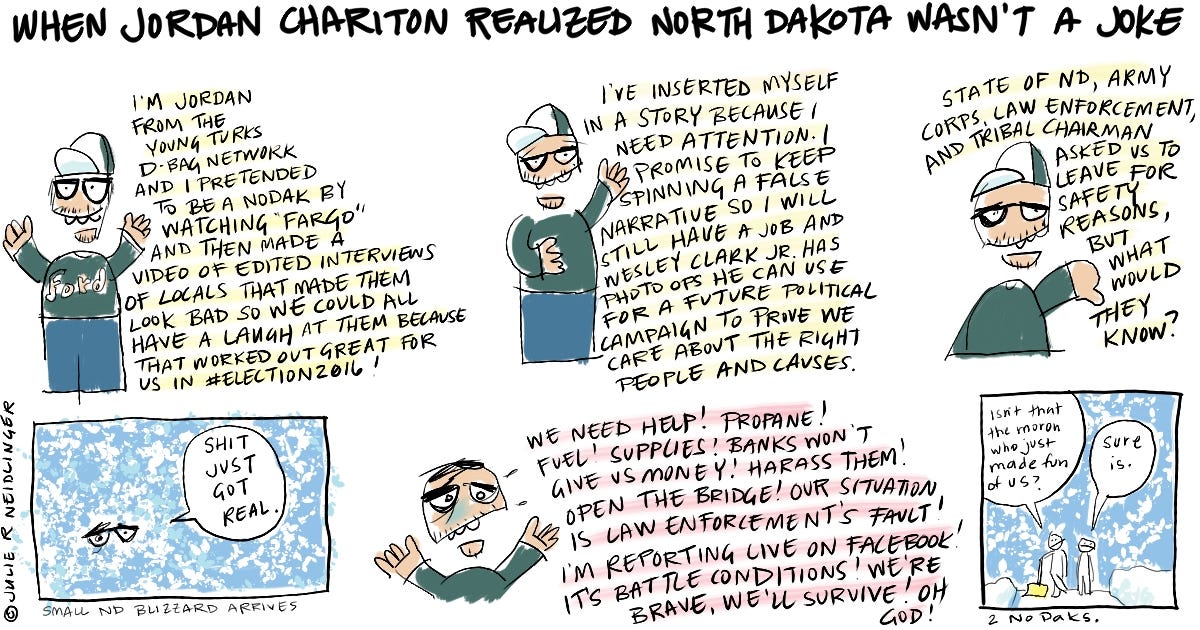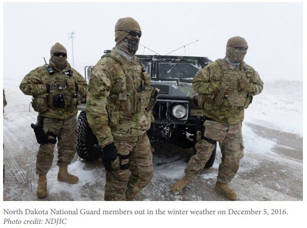 My guess is that the Task and Purpose headline was some kind of dog whistle for people angry about the recent presidential election of Donald Trump in which the whole world was apparently in a fetal position and desperate to figure out a way to exist and resist. The thought of having a bunch of disgruntled or badly-informed veterans head to the plains of North Dakota to fight against a small state and county’s very decent law enforcement made for great clickbait.