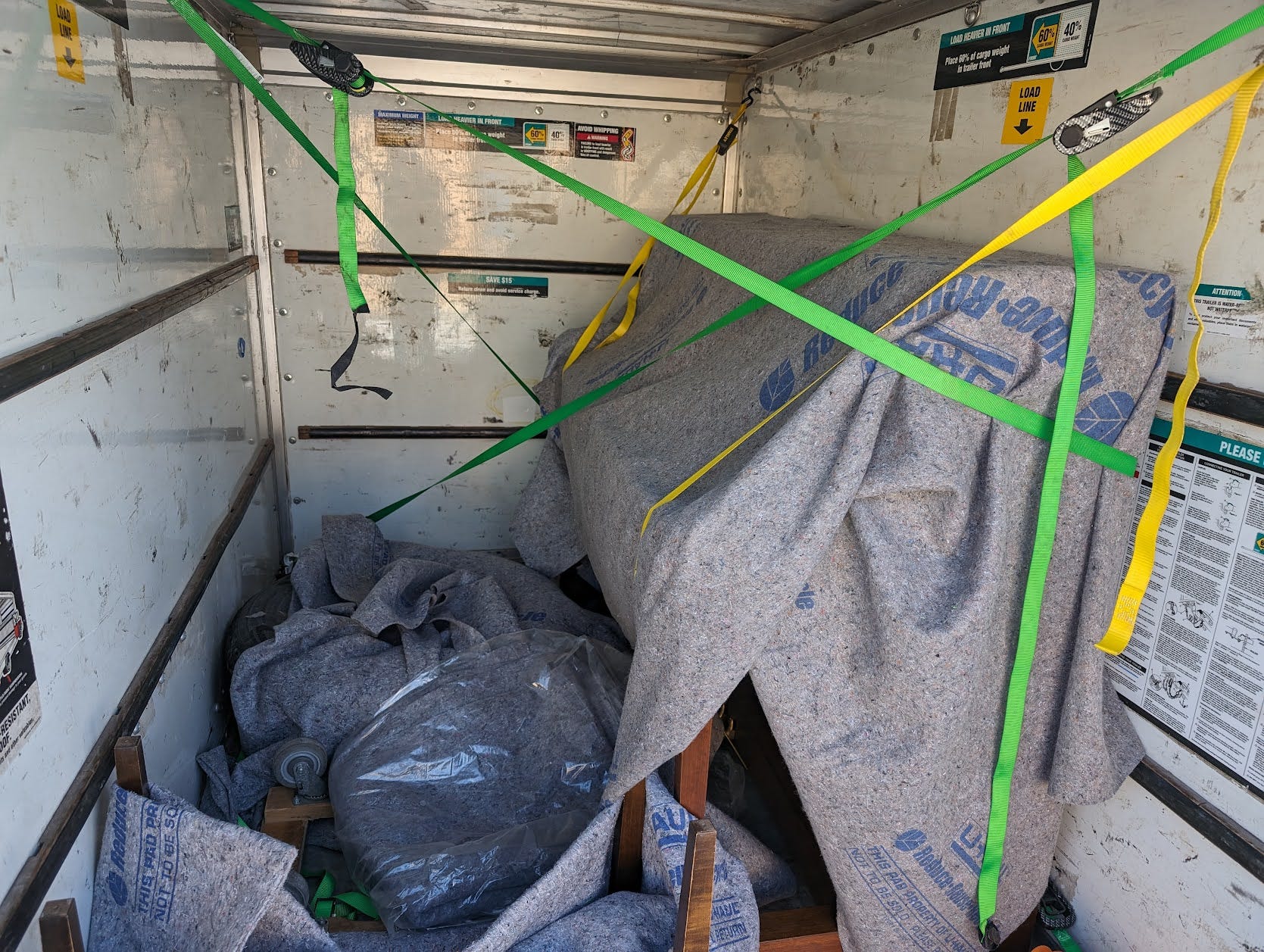 With some re-jiggering and several stupid moves that worked against the ratchet straps before we put our college educations to use and worked with the laws of physics instead of scratching our heads wondering why up wouldn’t go up, the piano was re-situated and firmly strapped to the trailer wall. There was plenty of room for the bench and the mocking flat tire.