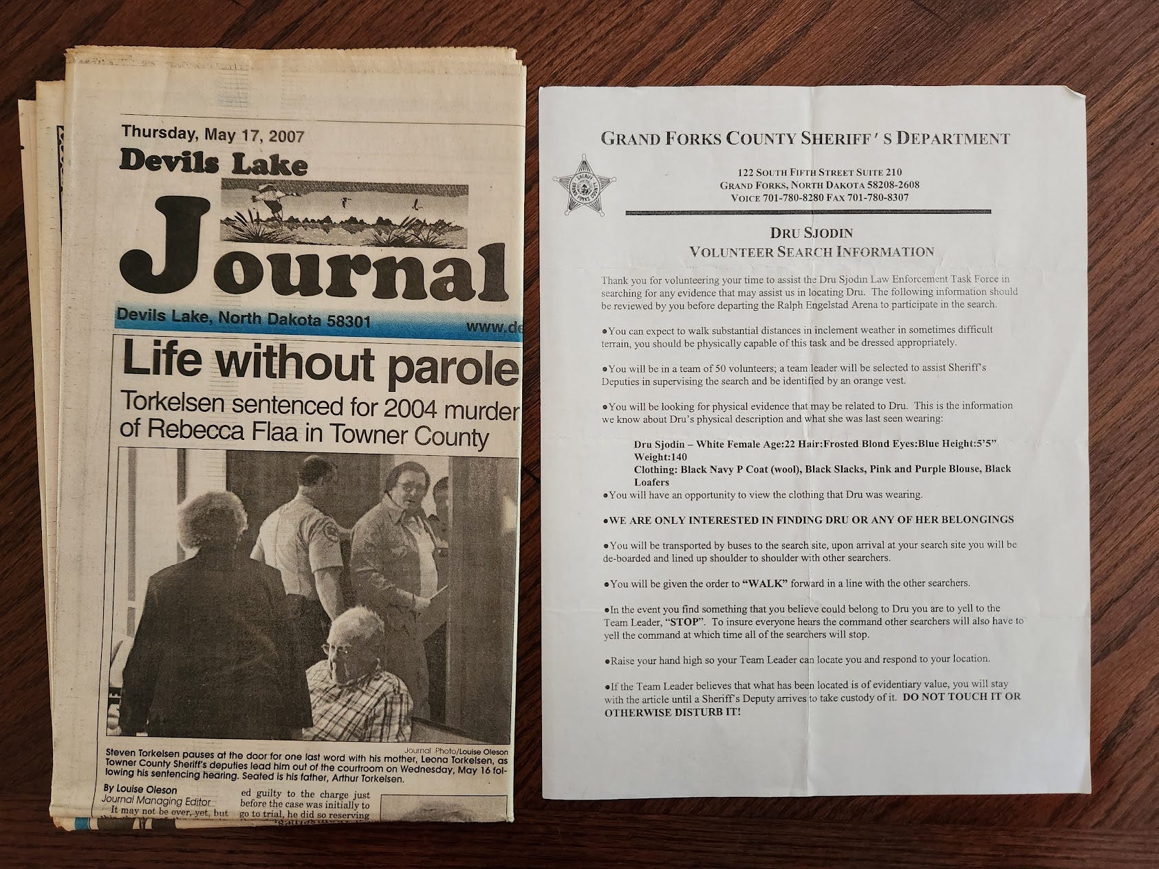 On the left is the newspaper I’ve saved all these years, because of that photo. On the right were the instructions we were given before our search for Dru Sjodin.